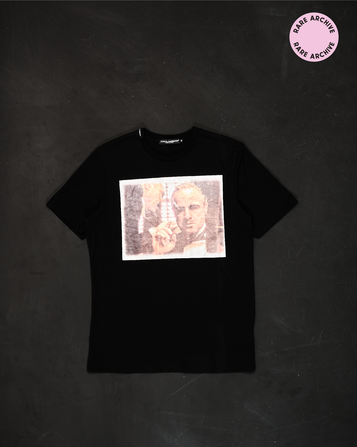 A striking piece of luxury cinema wear. This authentic Dolce & Gabbana t-shirt features a bold graphic of Marlon Brando as the iconic Don Vito Corleone, seamlessly blending high fashion with classic film history.