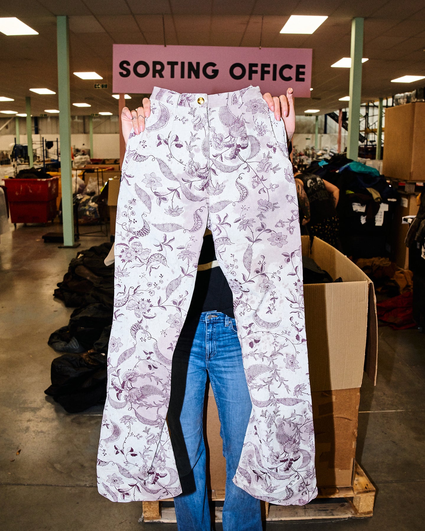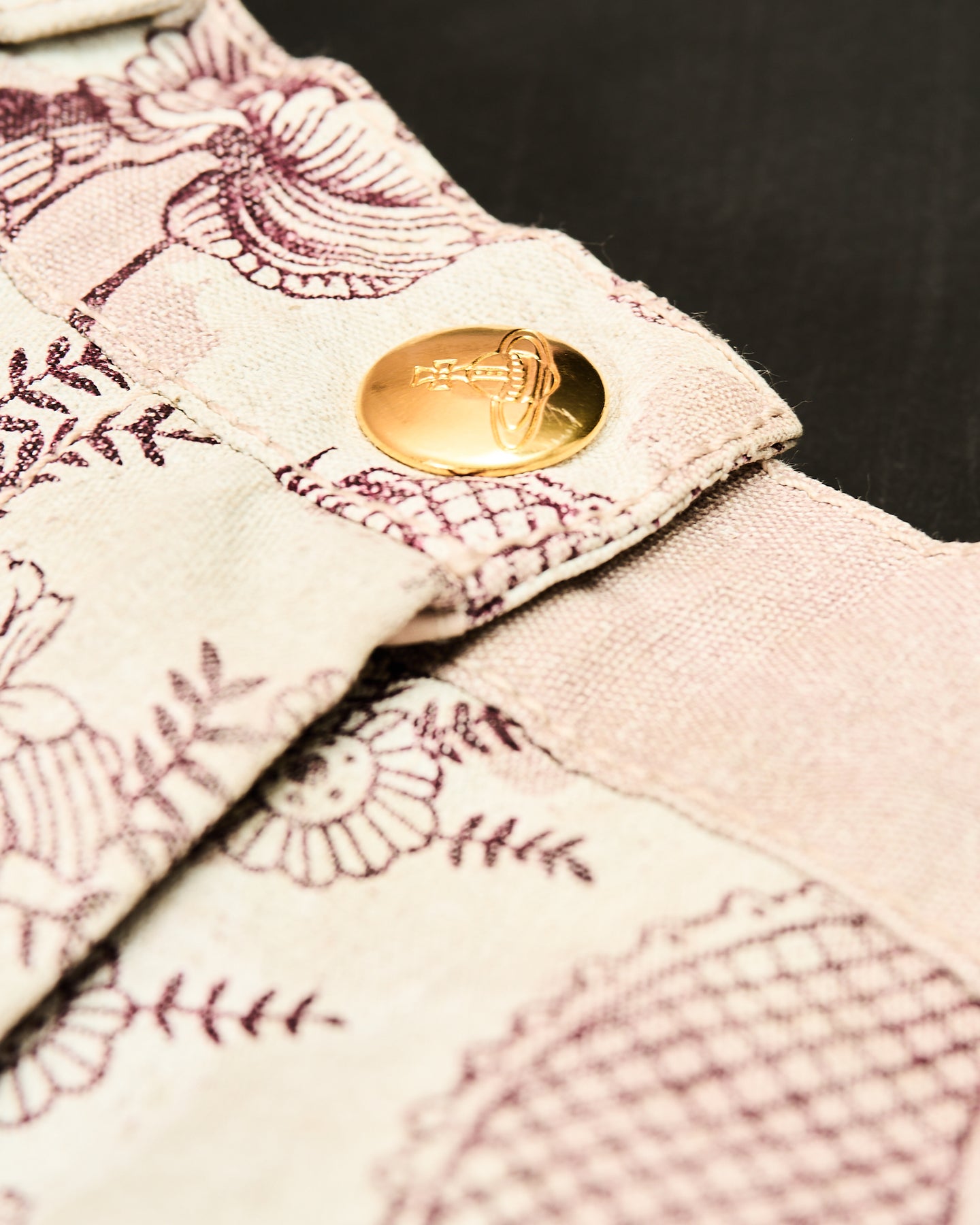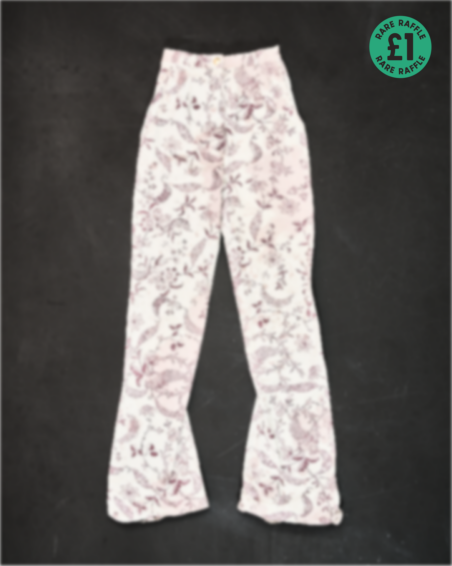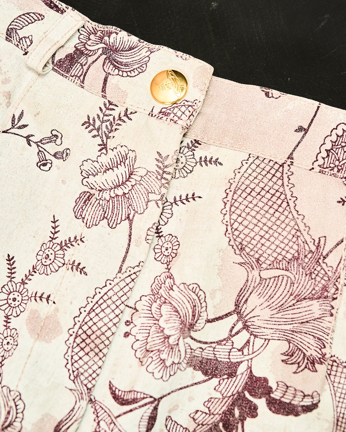 These striking trousers showcase the best of the iconic British designer, blending historical print motifs with a dramatic silhouette.