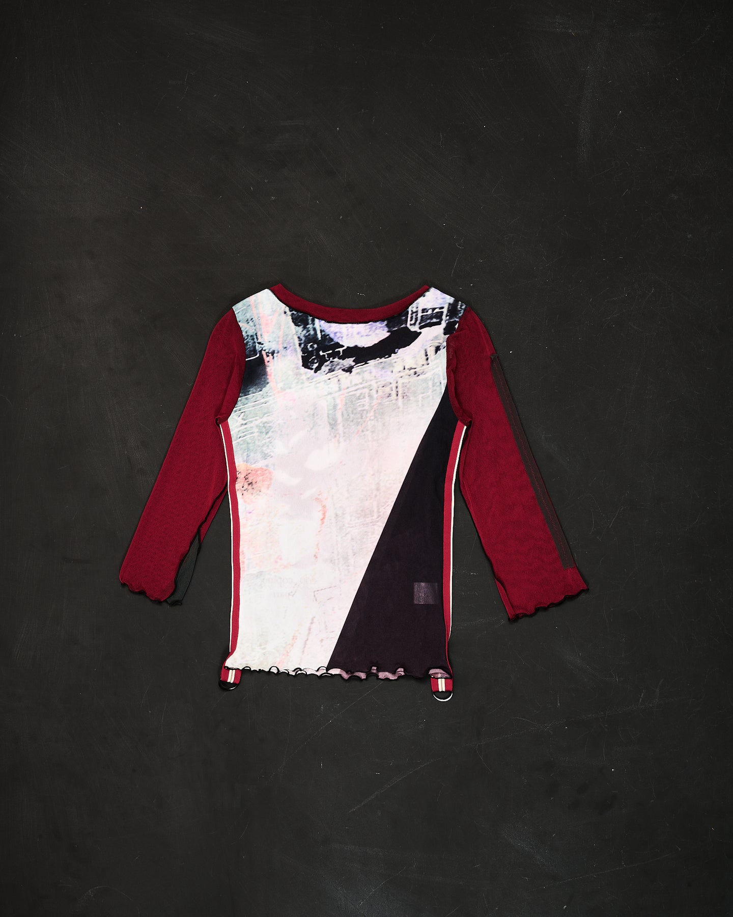 Fabric: High-stretch composition (likely a poly blend) combining a sheer, graphic mesh body panel with solid or ribbed sleeves/trim (burgundy/maroon).