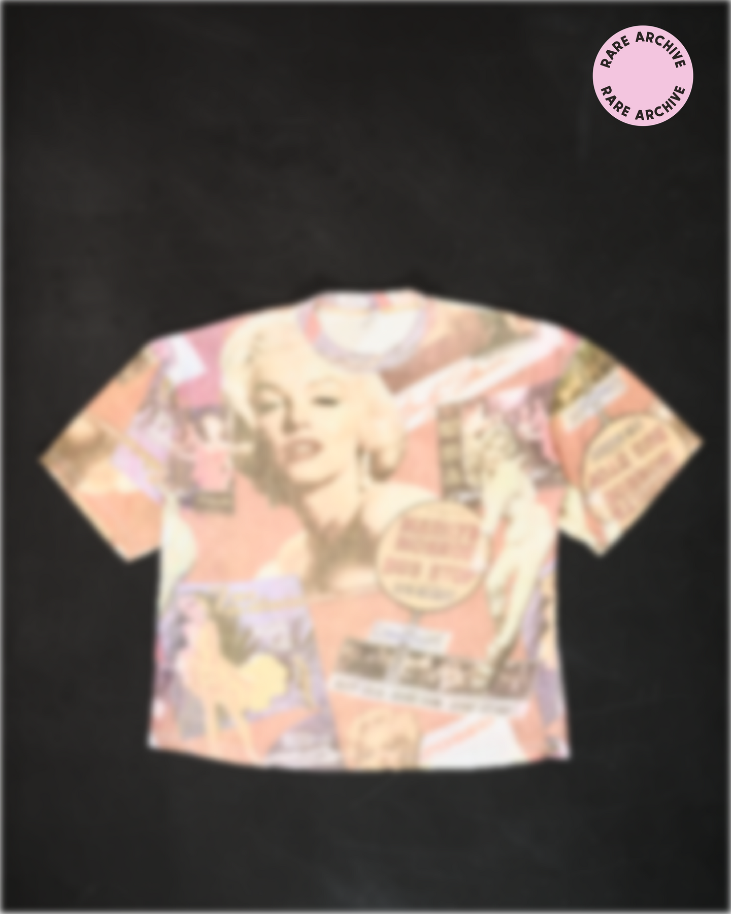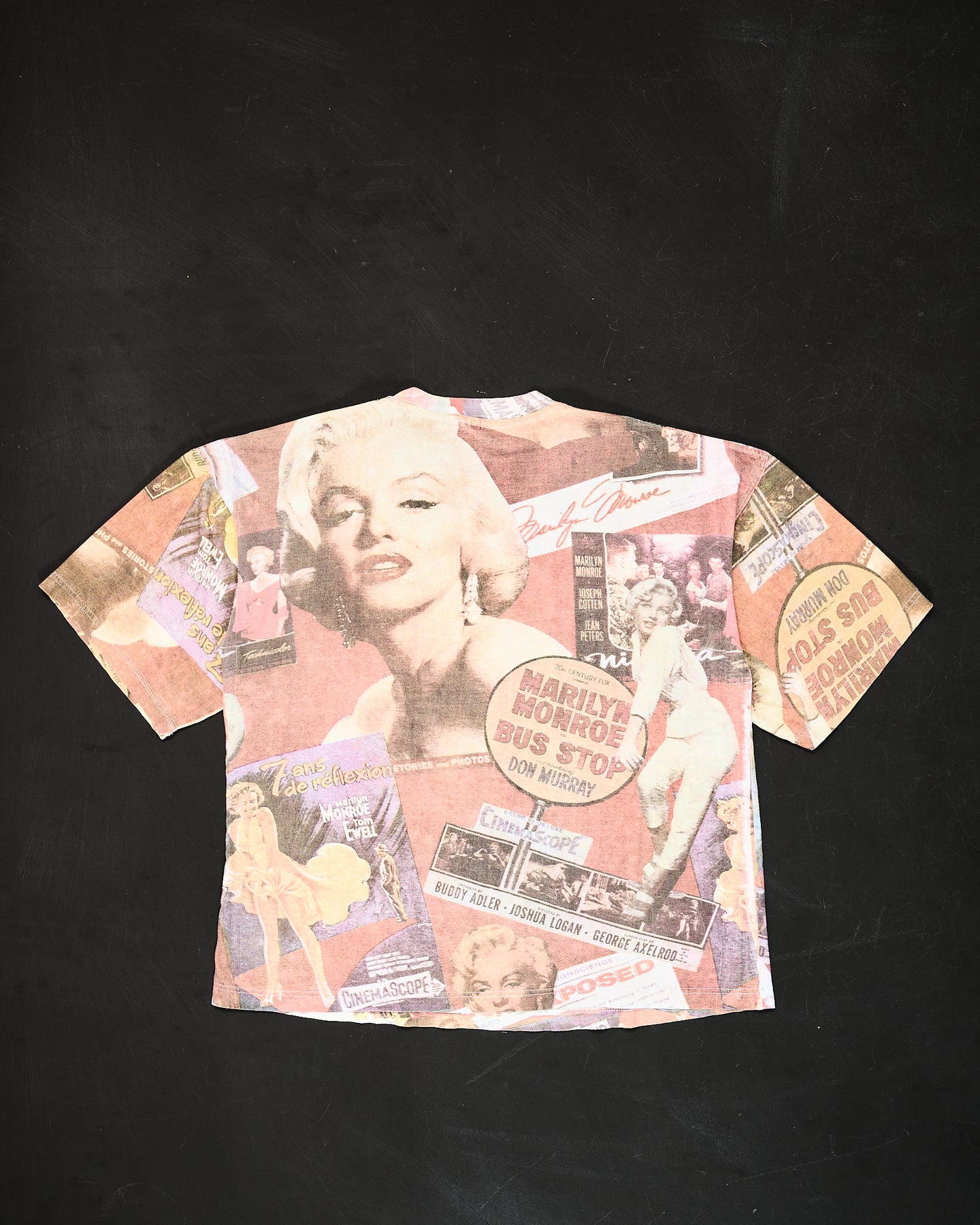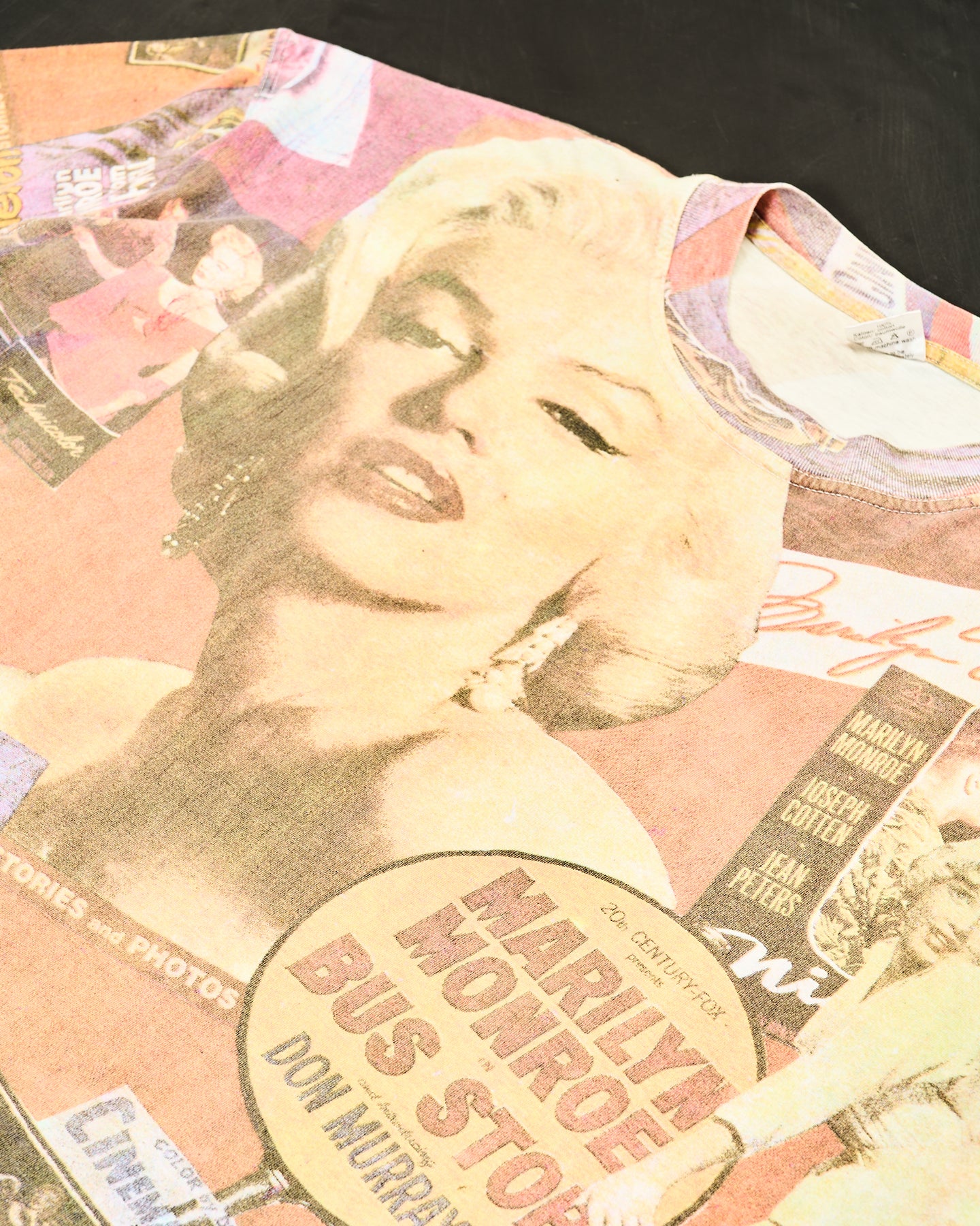 A statement piece from the golden era of graphic tees. This rare, authentic late 1990s All-Over Print t-shirt is a vibrant collage celebrating the legendary Hollywood icon, Marilyn Monroe.