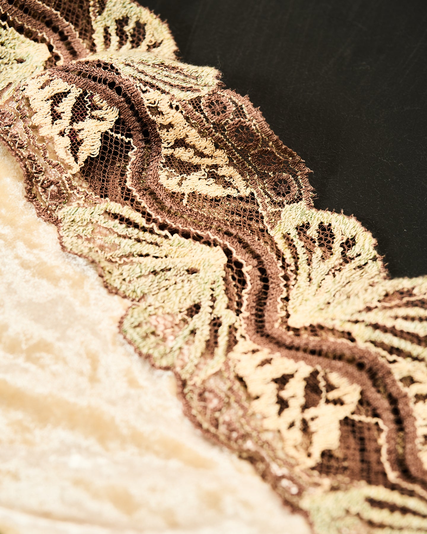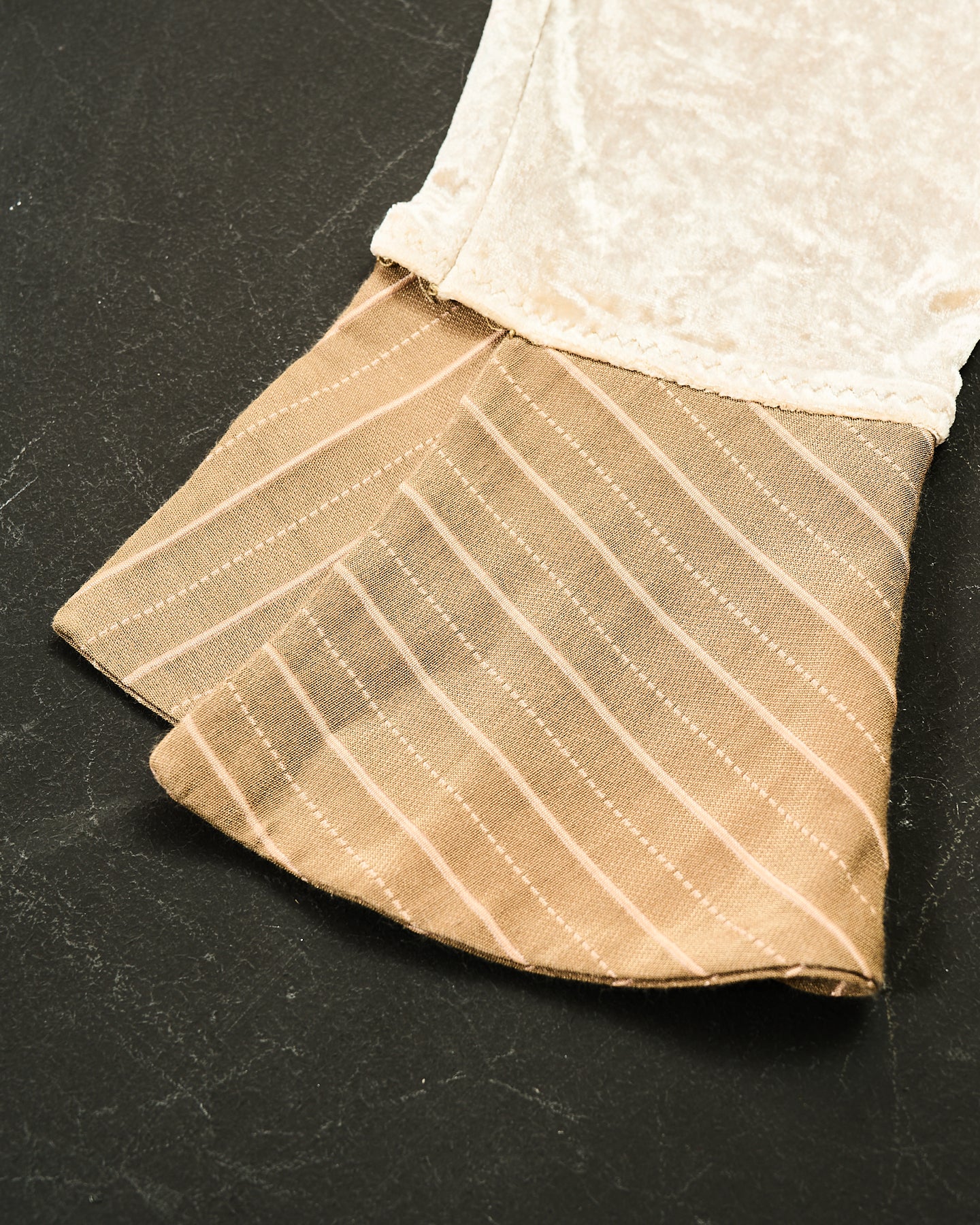 Mixed Media: Combines velvet with contrasting striped knit flared cuffs and elaborate sheer sections.