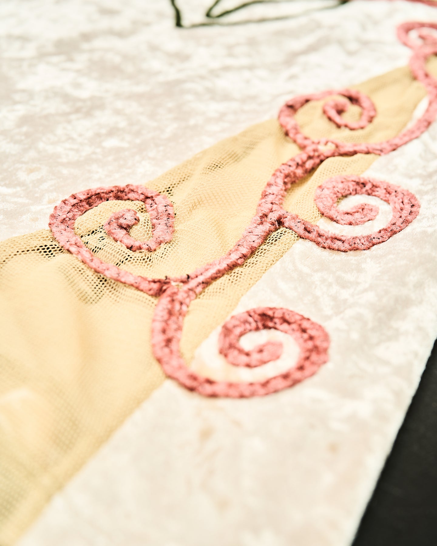 Baroque Detailing: Elaborate lace trim on the neckline and bold, scrolling embroidered rose motif on the chest.