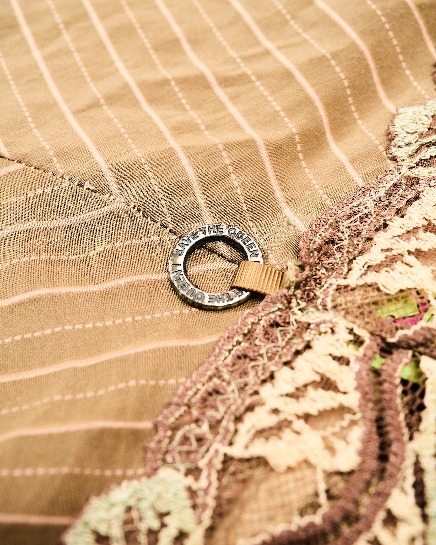 Hardware: Features a unique engraved "SAVE THE QUEEN" metal ring detail.
